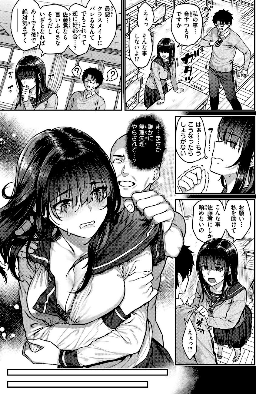 クラスメイトの地味めな女子・高島(たかしま)さんのえっちな裏アカを見つけてしまったメガネ男子・佐藤(さとう)。